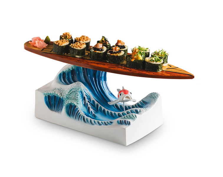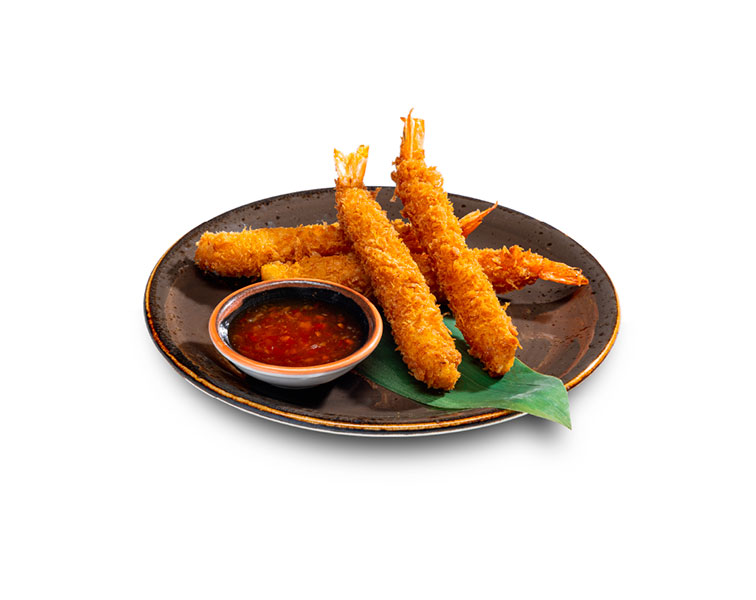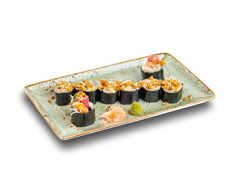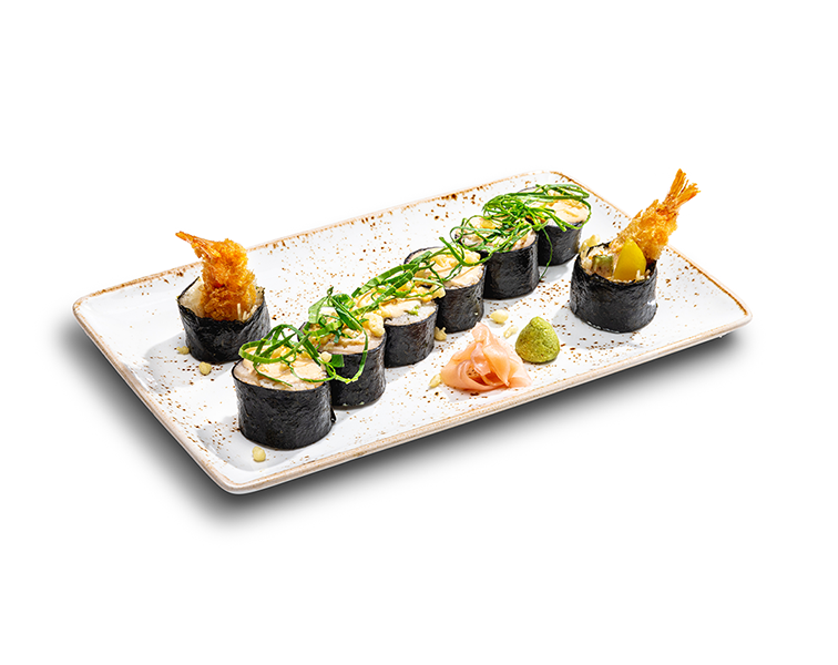 Eight noodle rolls with tempura battered prawn, avocado, mango, cream cheese, Thai mayonnaise and red shrimp roe.