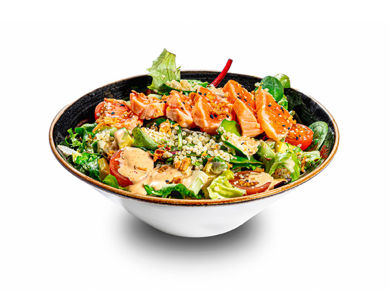 Green salad with organic quinoa, avocado, salmon tataki, cherry tomatoes, cucumber, crispy onion and kimuchi mayonnaise.