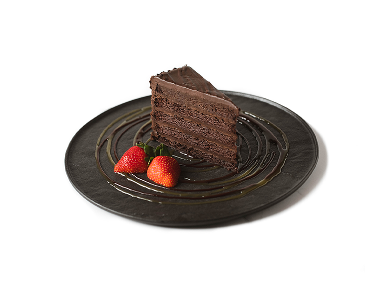 A four-layered chocolate cake topped with milk chocolate syrup and a juicy sliced strawberry with chocolate or vanilla ice cream.