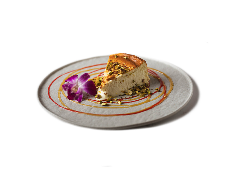 Homemade, freshly baked three cheese infused cheesecake garnished with crushed pistachios decorated with sweet raspberry syrup and caramel.
