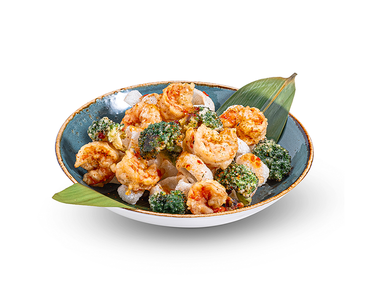 Tempura battered prawns with broccoli, sweet chili sauce and shichimi togarashi on a bed of fried rice noodles