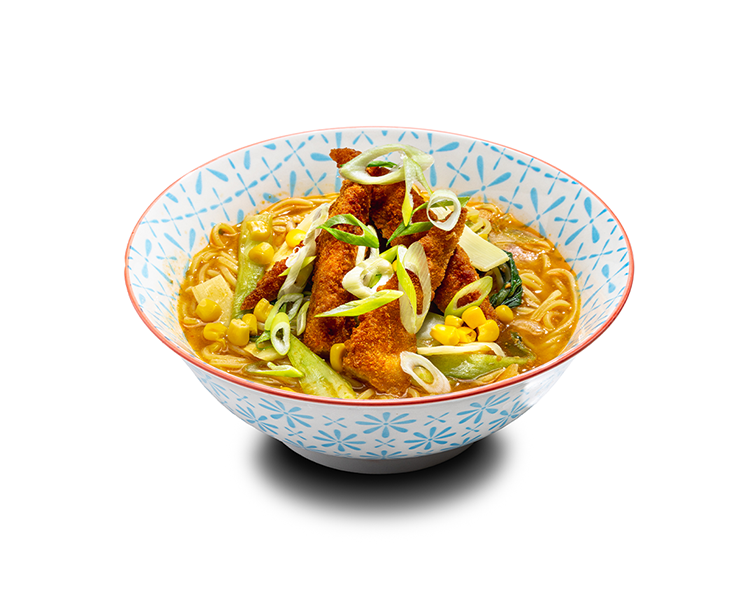 Ramen with vegetable broth and miso, plant-based chicken tenders, bamboo, purple onion, bok choi, shimeji mushrooms, corn and scallion.