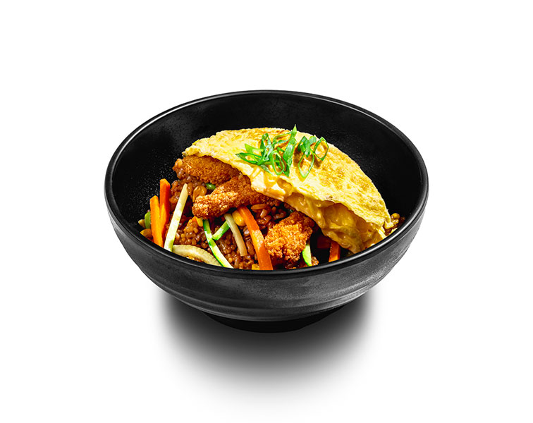 Rice with breaded chicken thigh strips, onion, shiitake mushrooms, dashi, scrambled egg, tonkatsu sauce and chive.