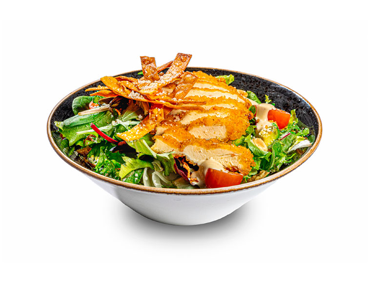 Green salad with avocado, cherry tomatoes, cornflake-crusted chicken breast, Caesar sauce with dashi, crispy corn chips, peanuts and grated Parmesan.