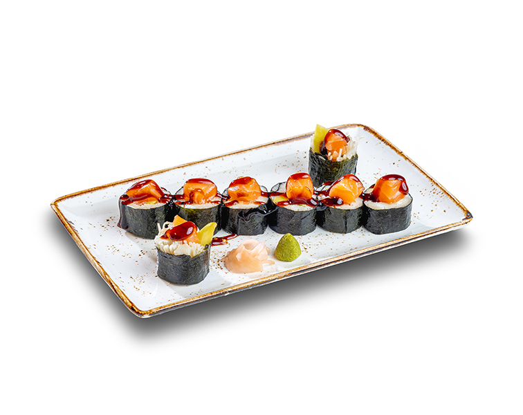 Eight noodle rolls with salmon, avocado, mango, cream cheese and teriyaki sauce.