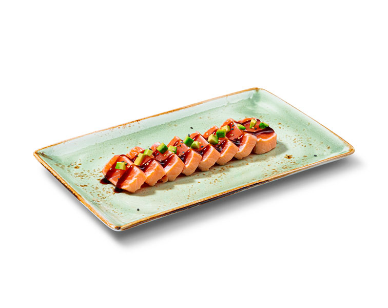 Marinated salmon, lightly grilled, thinly sliced and served with teriyaki sauce, diced avocado and sesame.