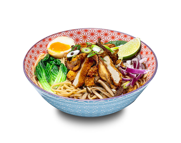Ramen with chicken broth, prepared with soy and miso, with breaded chicken, marinated soft-boiled egg, shimeji mushrooms, bok choi, spinach, red onion, shiitake mushrooms and lime.