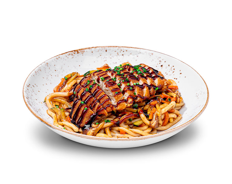 Stir-fried with shiitake mushrooms, carrot, zucchini, Chinese cabbage and cornflake-crusted chicken breast, yakisoba sauce and chive.