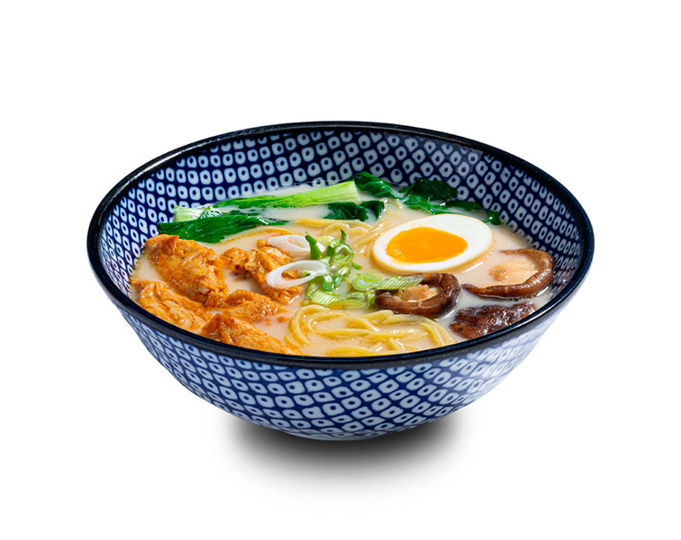 Ramen with vegetable broth, plant-based chicken tenders, shiitake mushrooms, pak choi, semicooked and marinated freerange egg and spring onion.