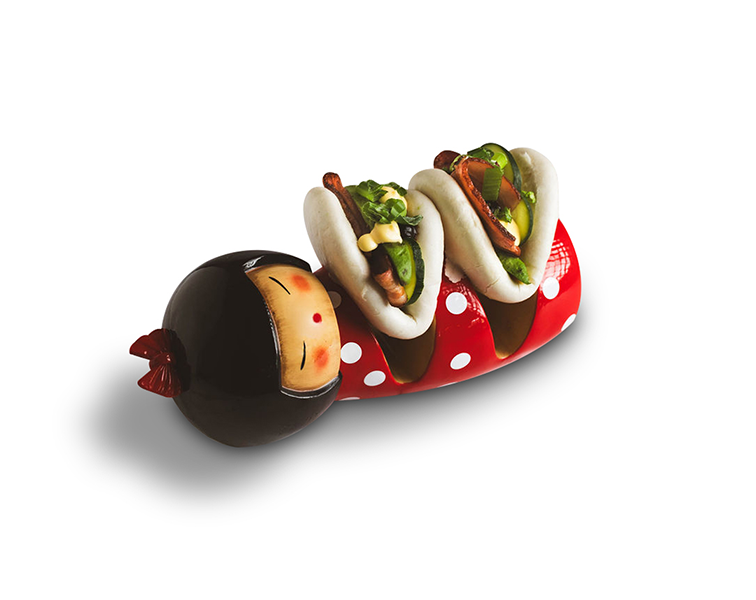 Two steamed Bao buns with roasted pork confit (chashu), cucumber, avocado, scallion, hoisin sauce and Japanese mayonnaise.