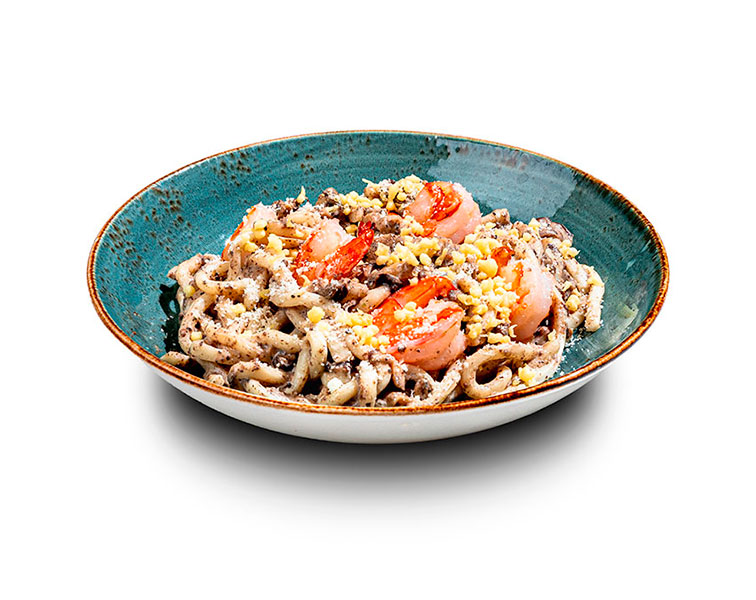 Homemade Udon noodles, cream, parmesan cheese, tartufata and marinated chicken.