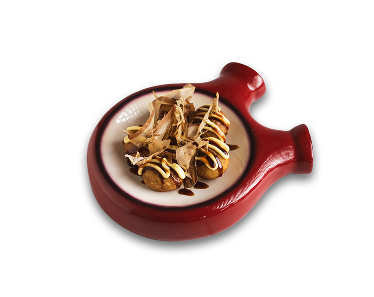 Four traditional Japanese octopus-filled balls, topped with Japanese mayonnaise, tonkatsu sauce, chive and katsuobushi.