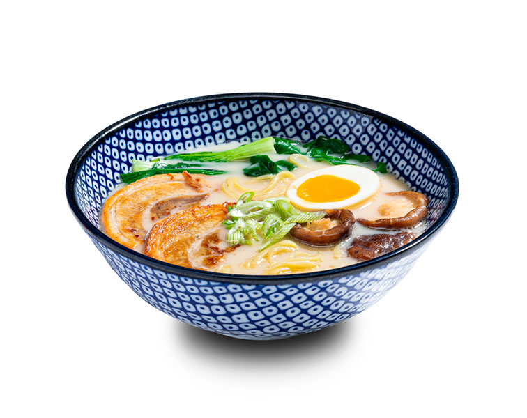 Ramen with chicken broth, prepared with soy, miso and yellow curry. With sliced marinated pork (chashu), bamboo, shiitake mushrooms, marinated soft-boiled egg and scallion.